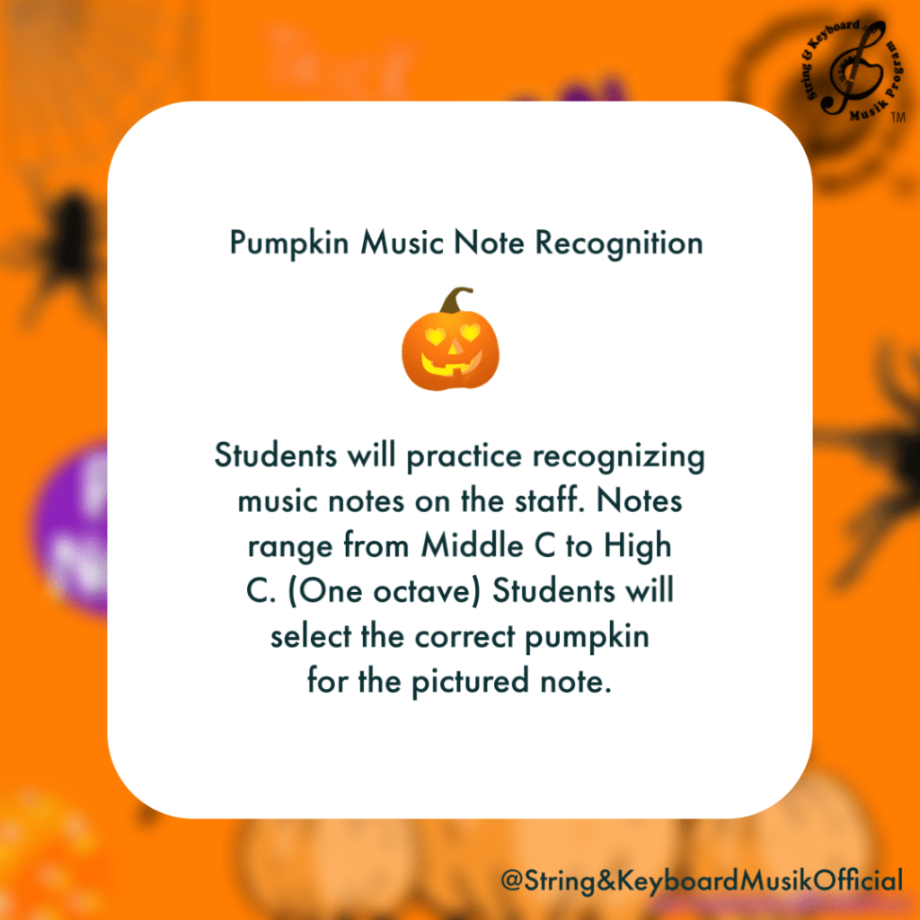 Students will practice recognizing music notes on the staff. Notes range from Middle C to High C. (One octave) Students will select the correct pumpkin for the pictured note.