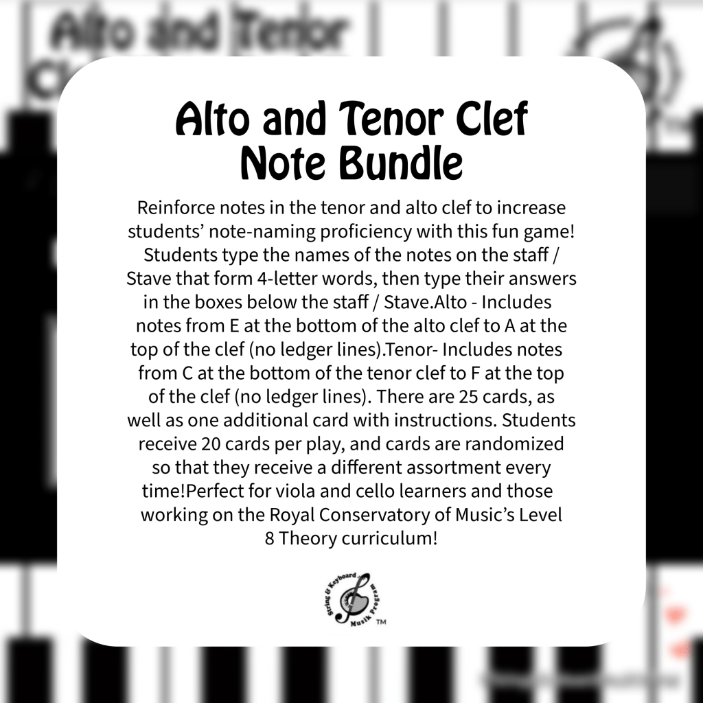 Reinforce notes in the tenor and alto clef to increase students’ note-naming proficiency with this fun game! Students type the names of the notes on the staff / Stave that form 4-letter words, then type their answers in the boxes below the staff / Stave. Alto – Includes notes from E at the bottom of the alto clef to A at the top of the clef (no ledger lines). Tenor- Includes notes from C at the bottom of the tenor clef to F at the top of the clef (no ledger lines). There are 25 cards, as well as one additional card with instructions. Students receive 20 cards per play, and cards are randomized so that they receive a different assortment every time! Perfect for viola and cello learners and those working on the Royal Conservatory of Music’s Level 8 Theory curriculum!