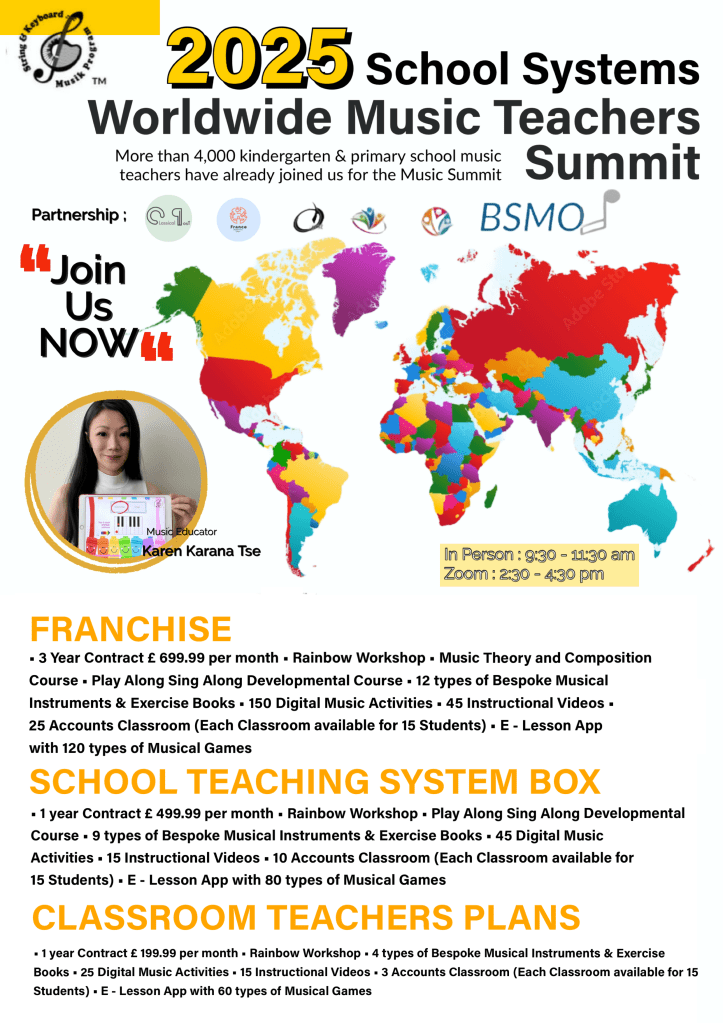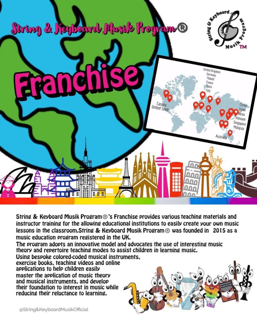 String & Keyboard Musik Program® ️ currently operates in 65 locations across 15 countries (China, United Kingdom, Singapore, Australia, Poland, Germany, Spain, Italy, Korea, Japan, Vietnam, Malaysia, France, Canada, Hong Kong, and the USA). We are currently awarding Franchise licenses in selected areas.