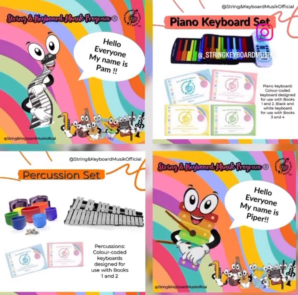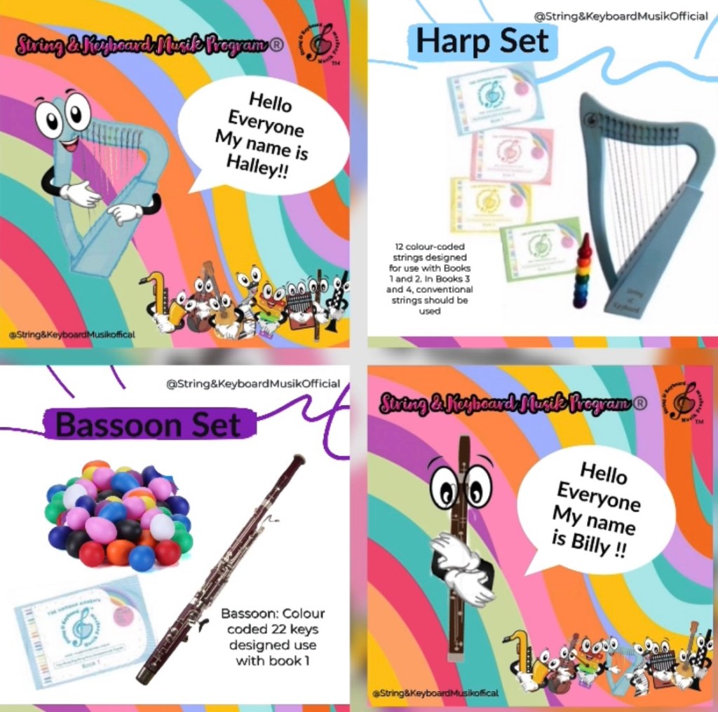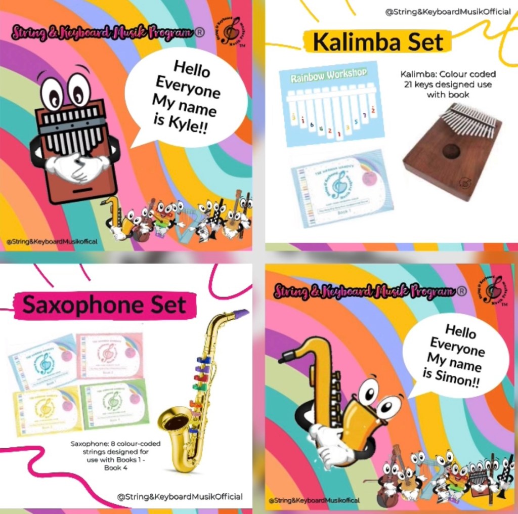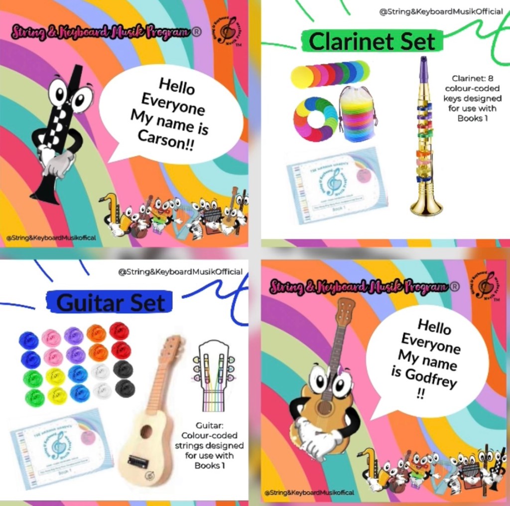 Piano keyboard: Colour-coded keyboard designed for use with Books 1 and 2. Black and white keyboard for use with Books 3 and 4. Percussions: Colour-coded keyboards designed for use with Books 1 and 2.Harp: 12 colour-coded strings designed for use with Books 1 and 2. In Books 3 and 4, conventional strings should be used. Clarinet: 8 colour-coded keys designed for use with Books 1.Kalimba: Colour coded 21 keys designed use with book. Saxophone: 8 colour-coded strings designed for use with Books 1.Clarinet: 8 colour-coded keys designed for use with Books 1. Guitar: Colour-coded strings designed for use with Books 1.Junior Violin: Colour-coded strings designed for use with Books 1 and 2. In Books 3 and 4, conventional strings should be used. Senior Violin: Regularstringsdesigned for the Senior class.