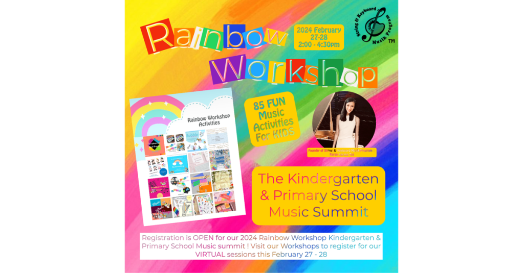 Registration is OPEN for our 2024 Rainbow Workshop Kindergarten & Primary school Music summit ! Visit our Workshops to register for our VIRTUAL sessions this February 27 – 28 and make huge progress in increasing your impact as kindergarten & primary music teacher!