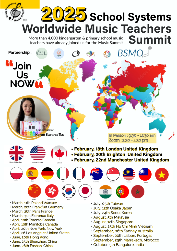 Our program is presently active in 78 locations across 19 countries, including the United Kingdom, Canada, the USA, Poland, Germany, Spain, France, Italy, Australia, Korea, Japan, Vietnam, Singapore, Malaysia, China, and Hong Kong & Taiwan. We are currently offering franchise licenses, School Teaching System Boxes, and Classroom Teachers Plans in specific regions. Over 4,000 music teachers for kindergarten and primary schools from 19 countries have already joined our program.