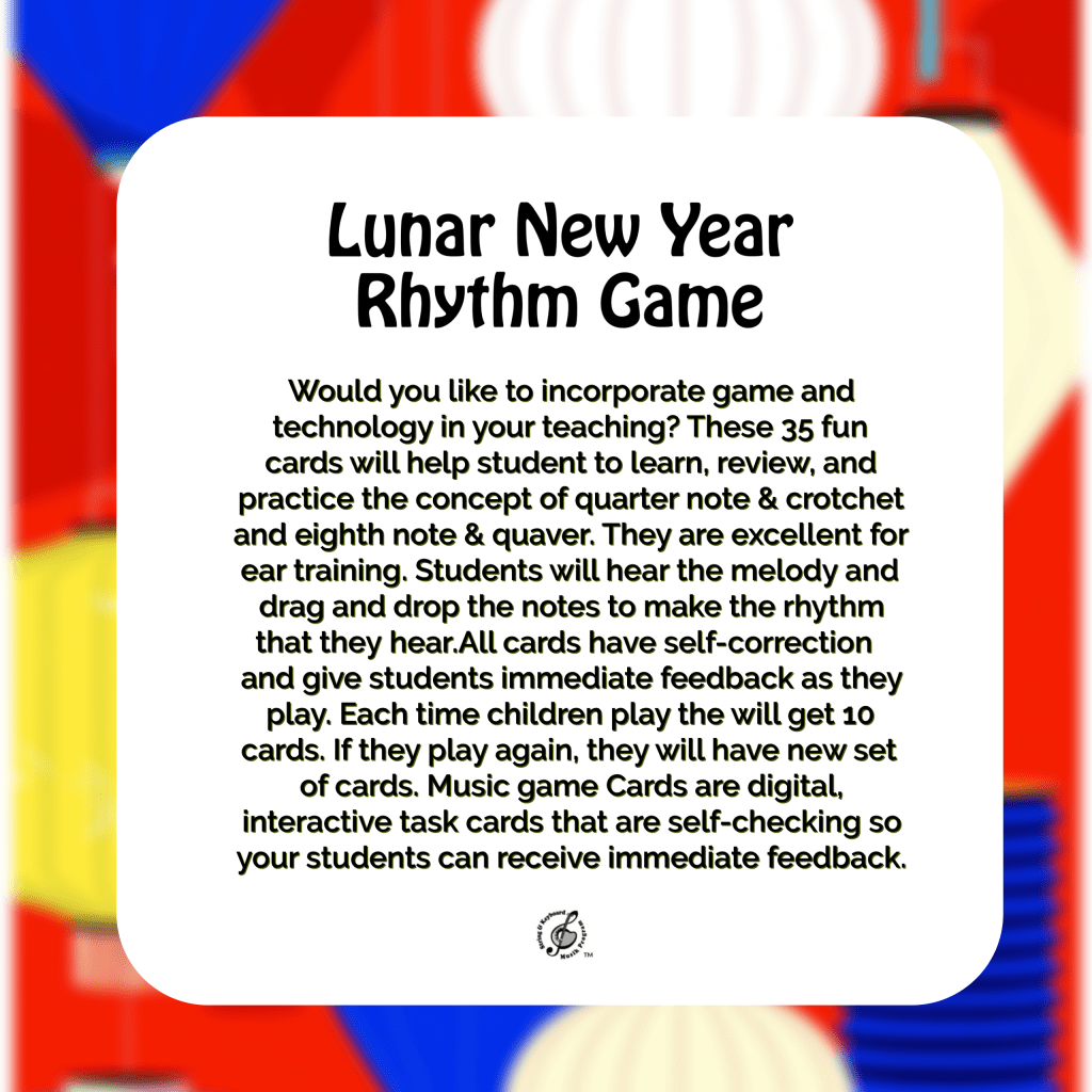 Would you like to incorporate game and technology in your teaching? These 35 fun cards will help student to learn, review, and practice the concept of quarter note & crotchet and eighth note & quaver. They are excellent for ear training. Students will hear the melody and drag and drop the notes to make the rhythm that they hear. All cards have self-correction and give students immediate feedback as they play. Each time children play the will get 10 cards. If they play again, they will have new set of cards. Music game Cards are digital, interactive task cards that are self-checking so your students can receive immediate feedback.