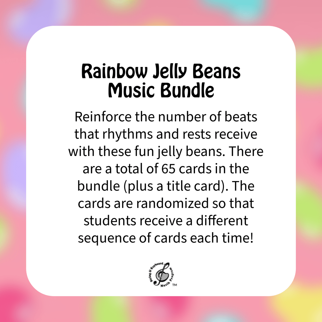 Reinforce the number of beats that rhythms and rests receive with these fun jelly beans. There are a total of 65 cards in the bundle (plus a title card). The cards are randomized so that students receive a different sequence of cards each time!