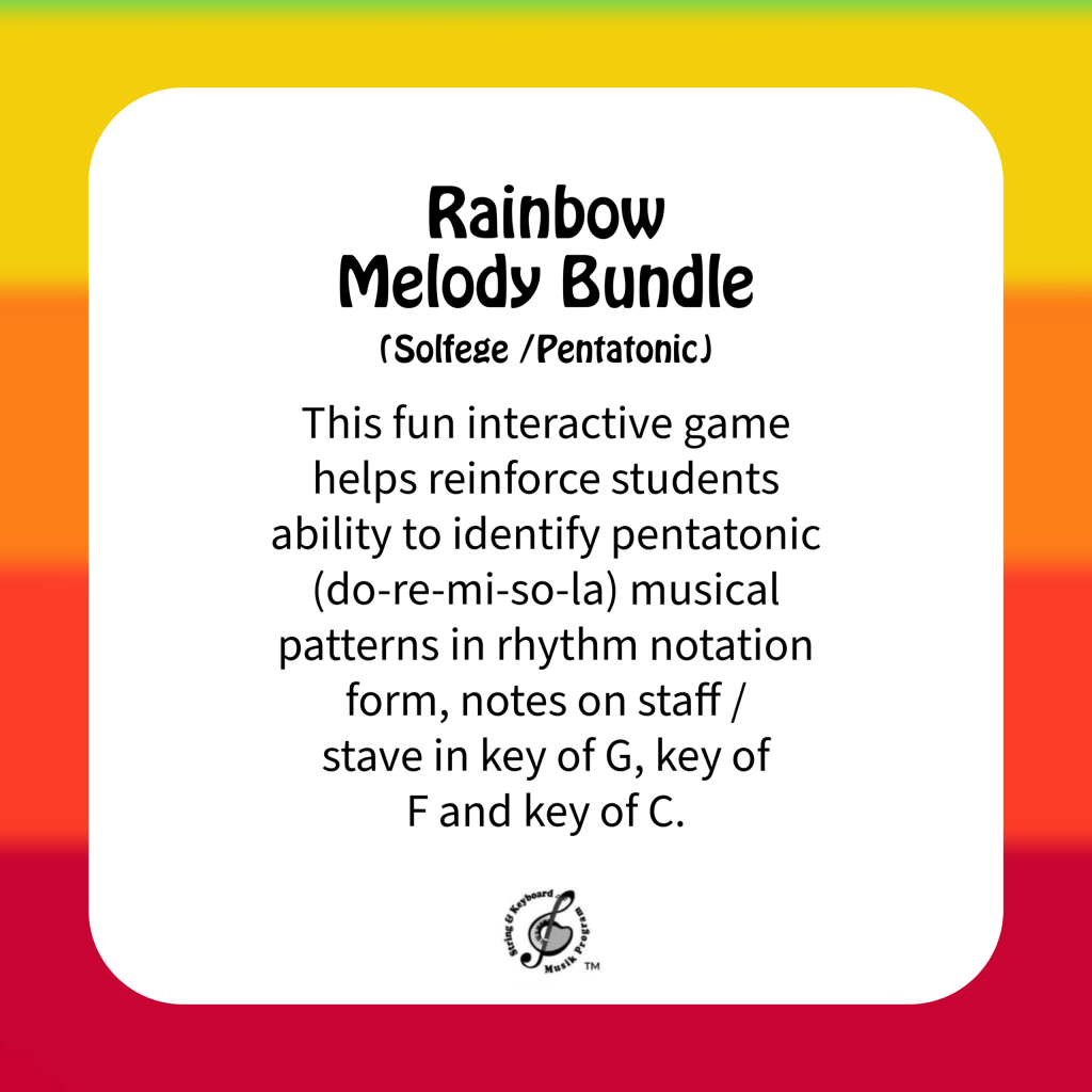 This fun interactive game helps reinforce students ability to identify pentatonic (do-re-mi-so-la) musical patterns in rhythm notation form, notes on staff / stave in key of G, key of Fand key of C.