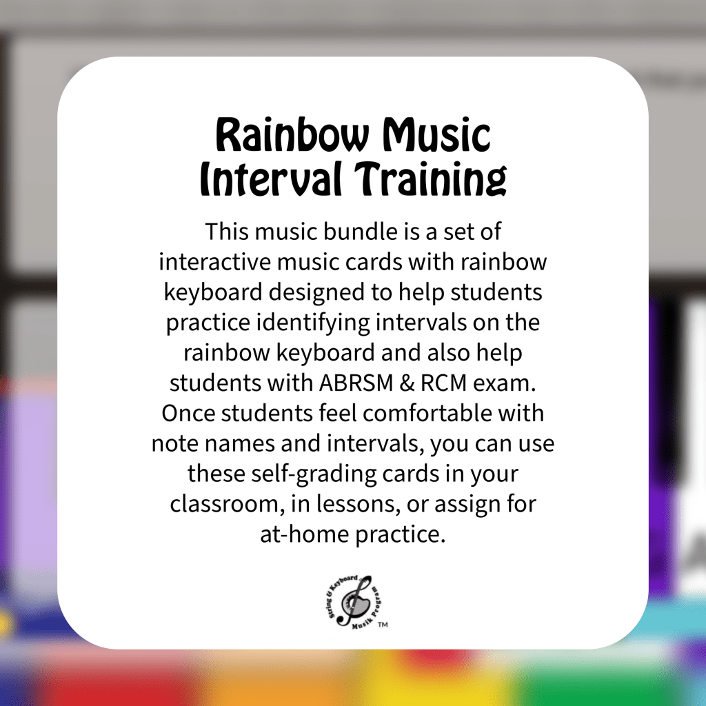 Rainbow Music Interval Training Bundle This music bundle is a set of interactive music cards with rainbow keyboard designed to help students practice identifying intervals on the rainbow keyboard and also help students with ABRSM & RCM exam. Once students feel comfortable with note names and intervals, you can use these self-grading cards in your classroom, in lessons, or assign for at-home practice.