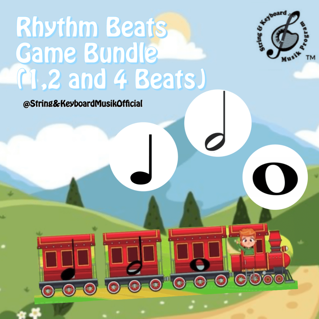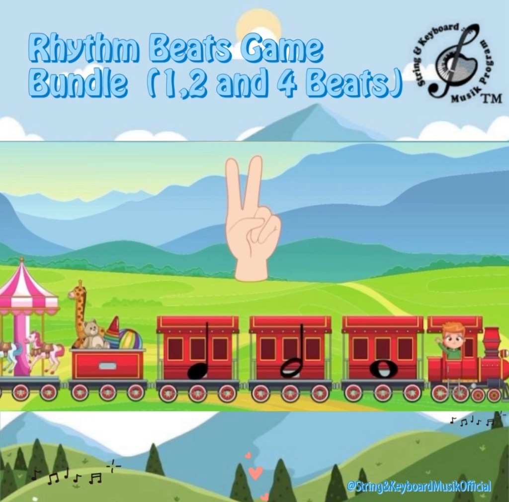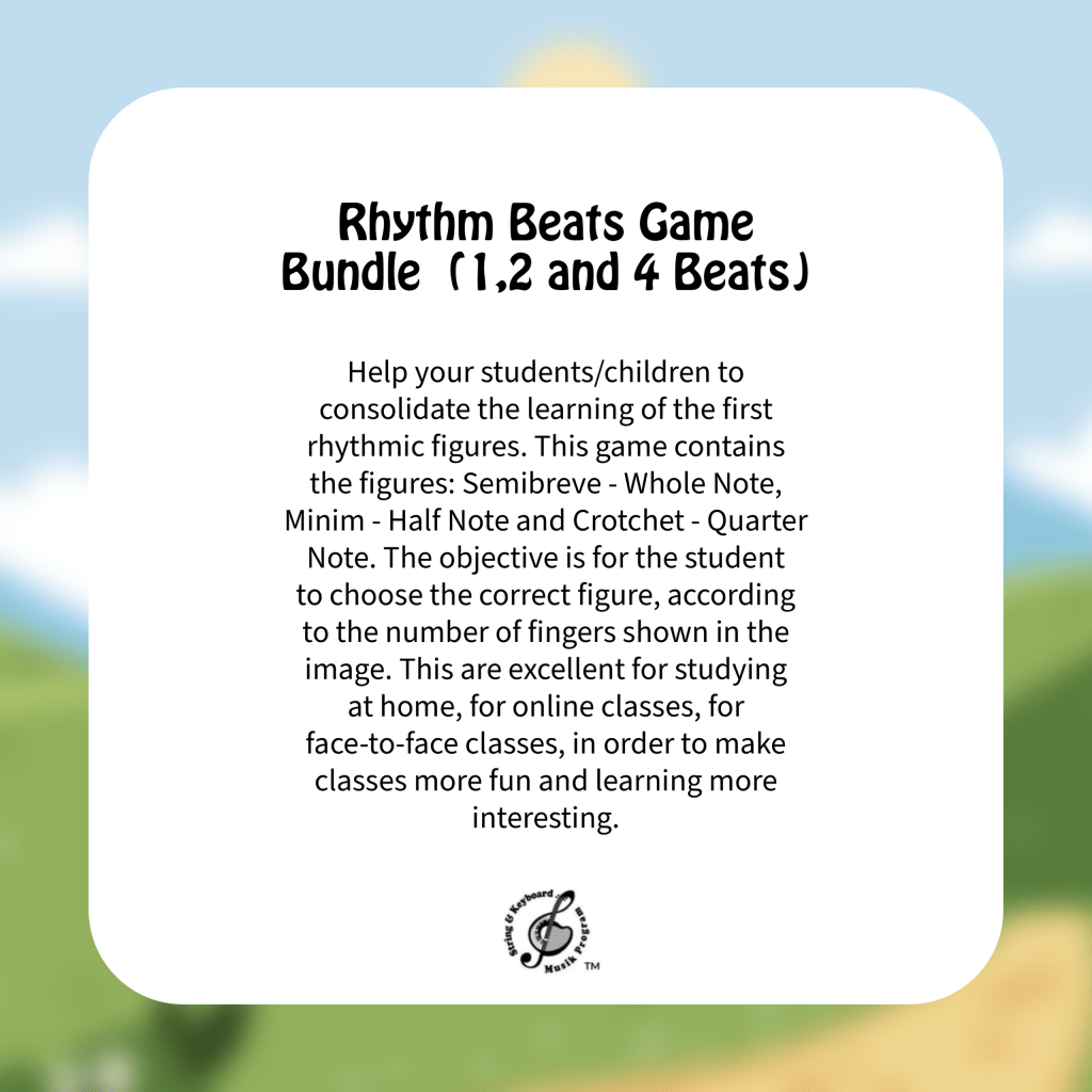 Help your students/children to consolidate the learning of the first rhythmic figures. This game contains the figures: Semibreve – Whole Note, Minim – Half Note and Crotchet – Quarter Note. The objective is for the student to choose the correct figure, according to the number of fingers shown in the image. This are excellent for studying at home, for online classes, for face-to-face classes, in order to make classes more fun and learning more interesting.