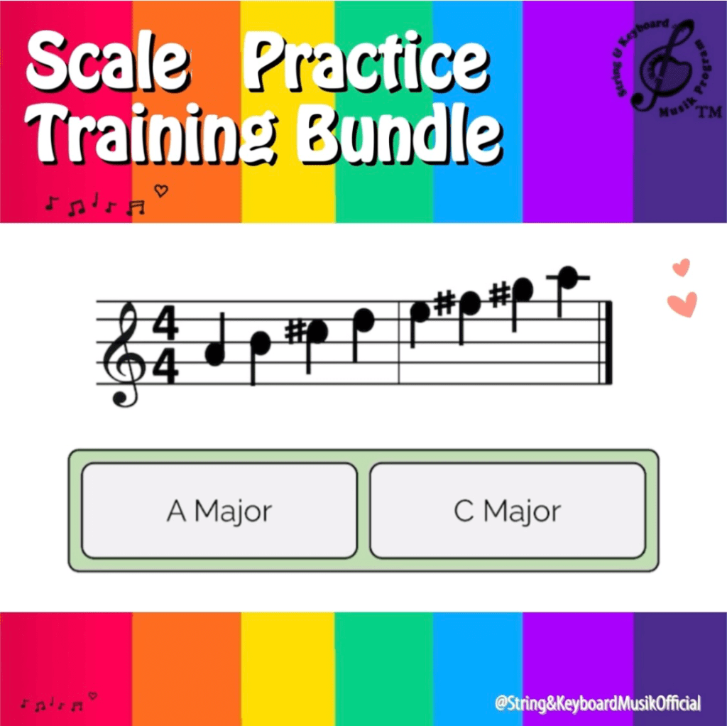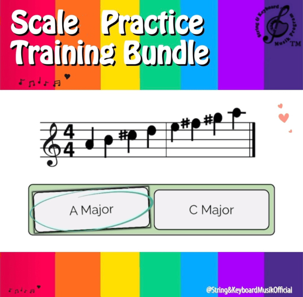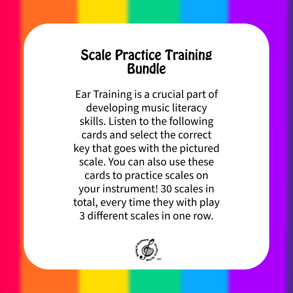 Ear Training is a crucial part of developing music literacy skills. Listen to the following cards and select the correct key that goes with the pictured scale. You can also use these cards to practice scales on your instrument! 30 scales in total, every time they with play 3 different scales in one row.
