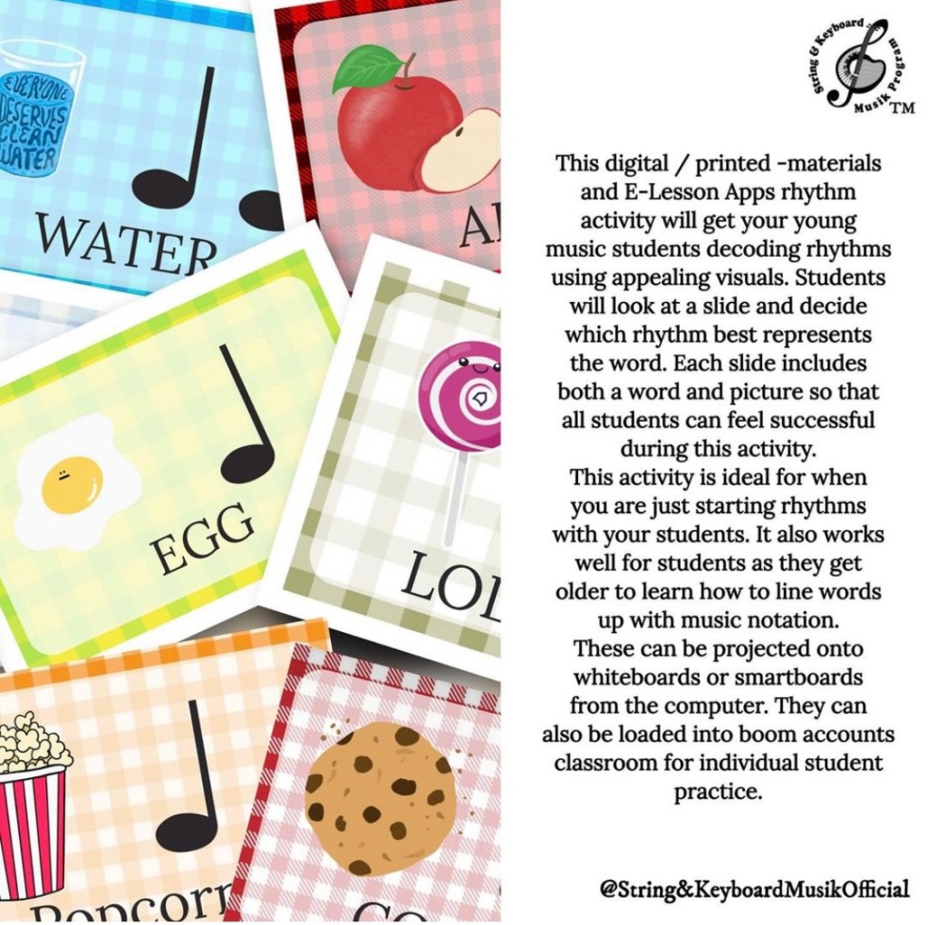 This digital / printed -materials and E-Lesson Apps rhythm activity will get your young music students decoding rhythms using appealing visuals.