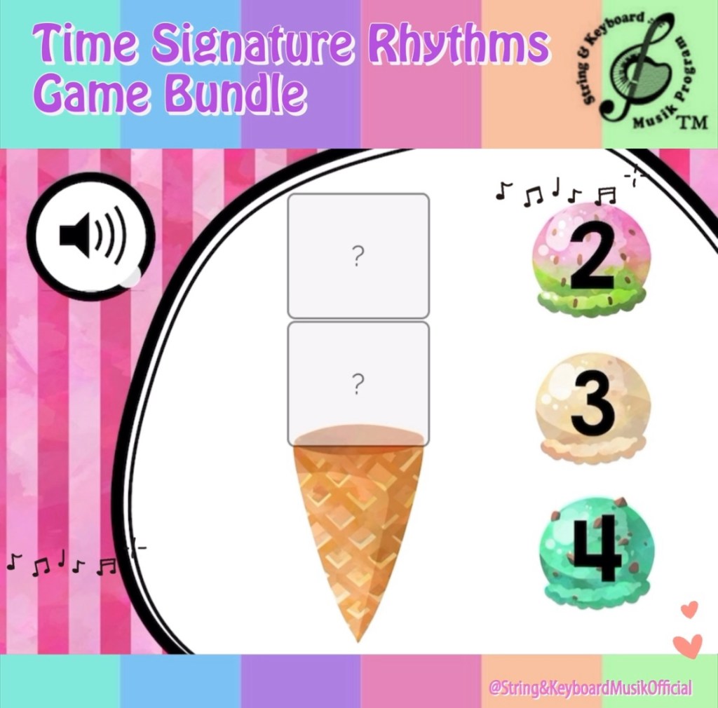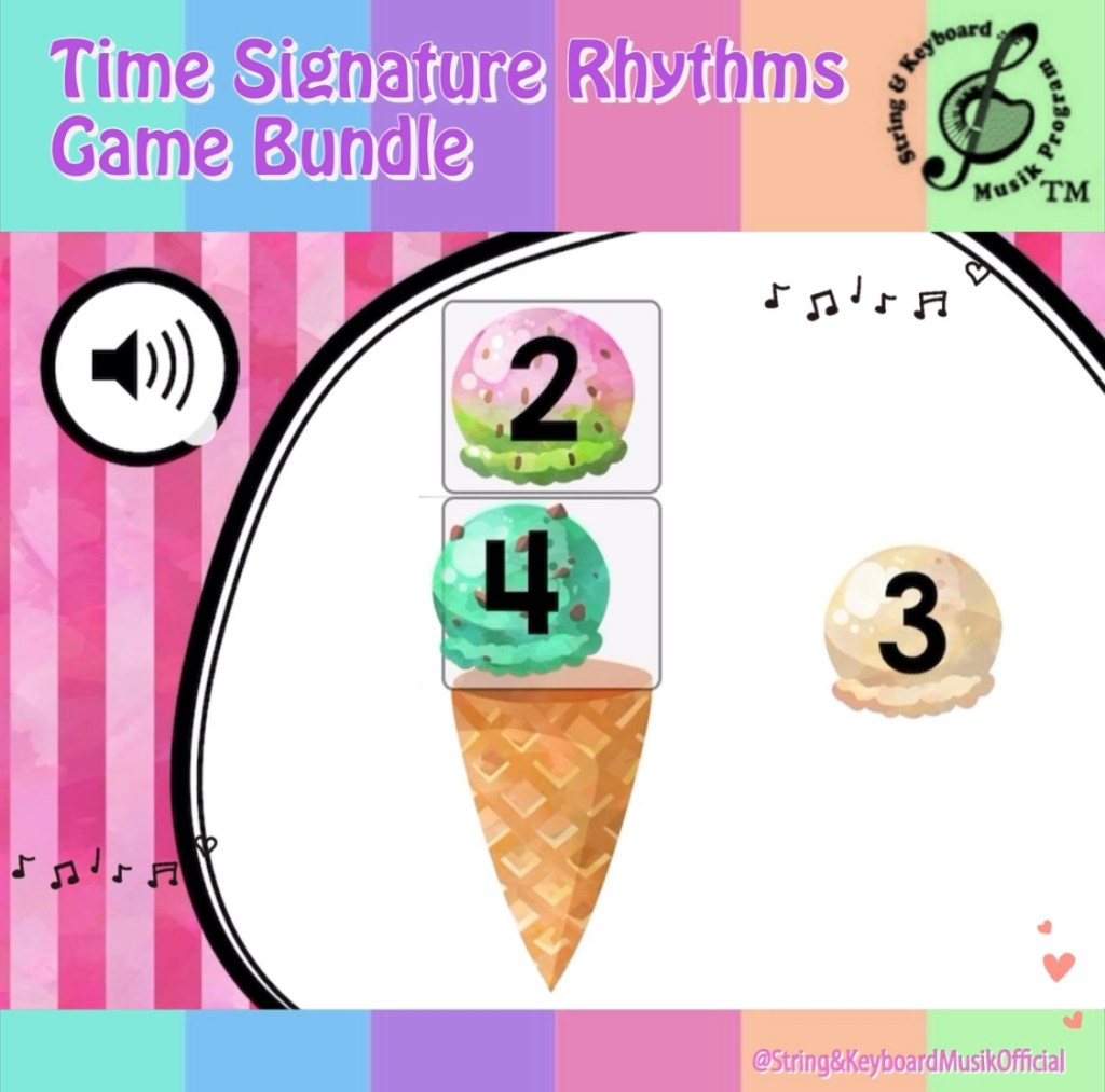 Review time signatures through ear training in an exciting way with these self-grading music task cards! You and your music theory students will enjoy how easy it is to use this interactive music game. Use in class as a whole-group review, assessment, or assign it for individual practice for virtual lessons. Suitable for piano lessons, band class, or any music-related or rhythm related curriculum! Features of this no-prep resource: Simple and colourful visuals 17 cards in this self-shuffling game Straightforward instructions – students listen to a musical excerpt (excerpts include flute, piano, drums and more) and drag the correct ice-cream numbers onto the ice-cream cone. Game Cards are self-grading and no prep! Makes reviewing and teaching a breeze for teachers.