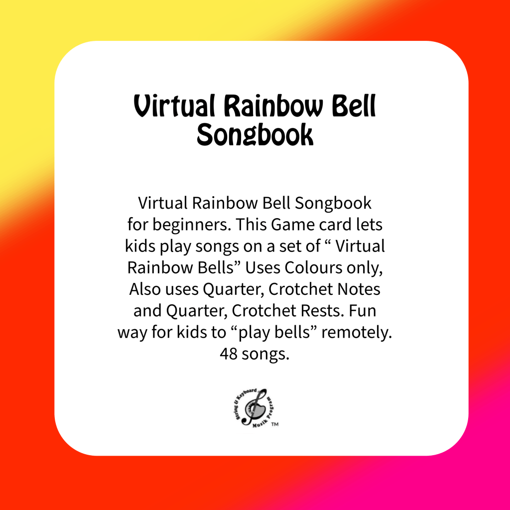 Virtual Rainbow Bell Songbook for beginners. This Game card lets kids play songs on a set of “ Virtual Rainbow Bells” Uses Colours only, Also uses Quarter, Crotchet Notes and Quarter, Crotchet Rests. Fun way for kids to “play bells” remotely.